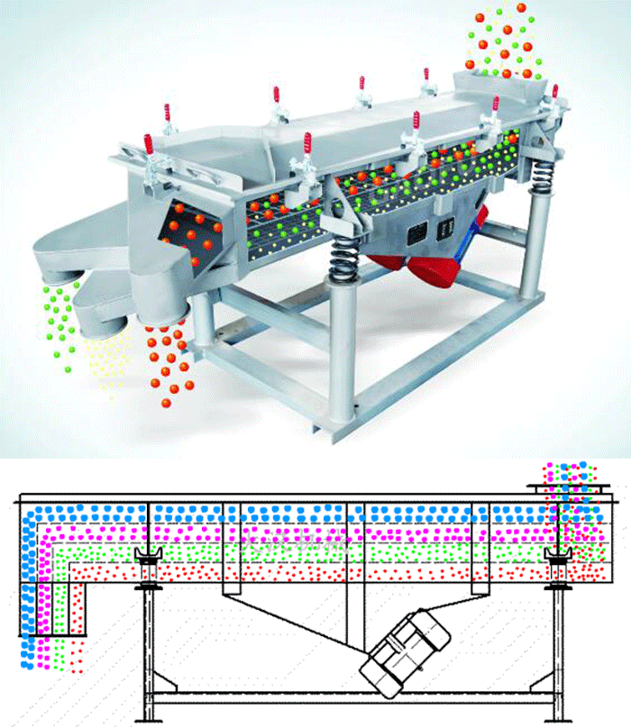 多層直線振動(dòng)篩利用雙臺(tái)電機(jī)作為振動(dòng)源,物料在篩網(wǎng)上受激振力的作用被拋起,同時(shí)向前做直線運(yùn)動(dòng),物料從給料機(jī)均勻地進(jìn)入直線篩進(jìn)料口后,通過多層篩網(wǎng)產(chǎn)生了數(shù)種不同規(guī)格的篩上物、篩下午,后分別又從各自的出口排出。